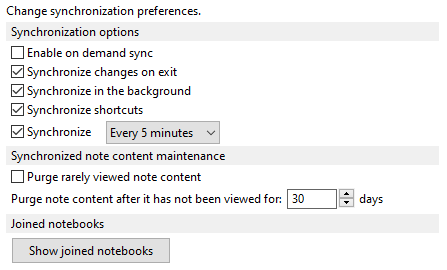 Enable on demand sync ist nicht notwendig. Ein Sync "irgendwann" kann die Arbeit in Evernote ausbremsen. Ich bevorzuge klare Regeln... Synchronize on exit ist ein Muss. Wenn du Evernote verlässt, verlässt du dich darauf, dass deine Daten sicher (und überall auch wieder erreichbar) sind. Ein Rechner-Tod könnte da bösen Schaden anrichten... Synchronize in the background ist OK - auch wenn es manchmal aussieht, wie wenn es langsam von statten geht. Aber du willst meistens schon wieder weiterarbeiten wenn du einen Sync ausgelöst hast... Synchronize every 5 minutes ist OK weil ich sowieso fast immer mit Evernote arbeite und auch Evernote selbst nicht vor Fehltritten (Abstürzen) sicher ist ;-) Purge rarly viewed note content ist nicht notwendig. In unserer modernen Welt kostet Speicher lokal und in der Cloud "nichts" während Internet-Verbindungen immer verfügbar und schnell sind. Warum also mit ein paar Bytes geizen... Ich verwende keine joined notebooks. In privaten Anwendungen habe ich bisher keine Notwendigkeit gesehen... Meine Daten gehören mir.